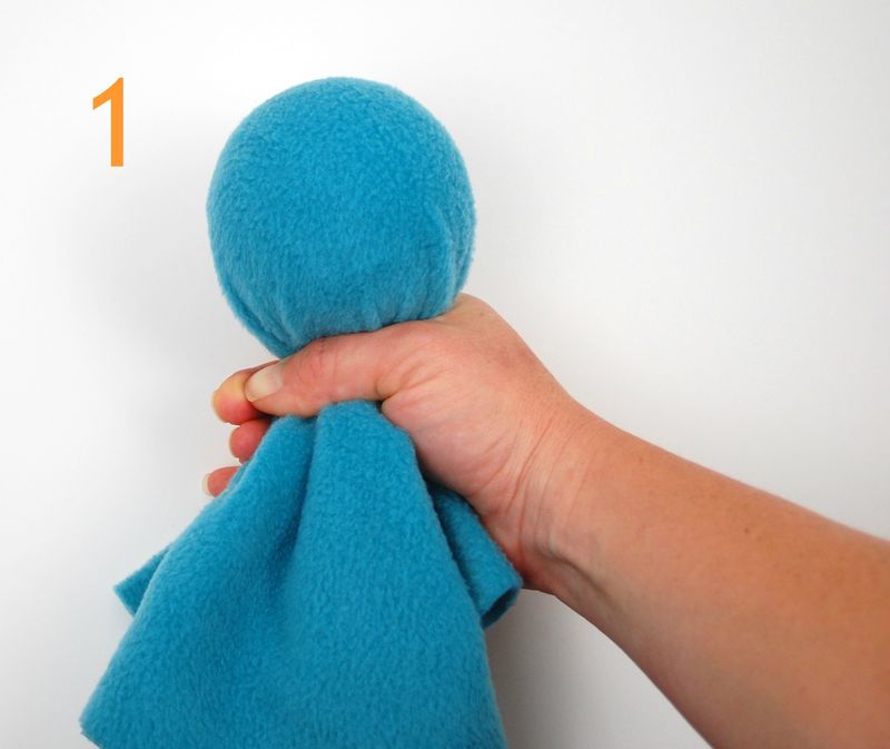 Míček položte doprostřed látky a obalte ho. Zavažte pevně šňůrku, aby míček nevypadl. Vznikla nám hlavička chobotnice, na kterou nalepte pohyblivé oči. Pod ně nakreslete ústa.