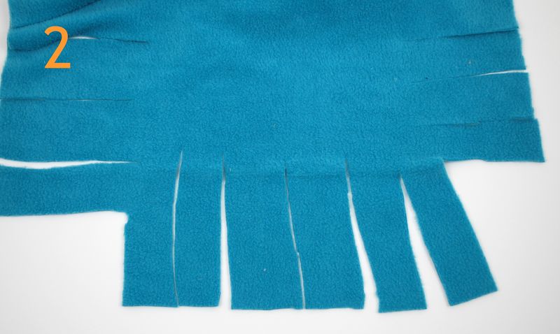 Zbytek látky, který vám najde doma maminka, si připravte na stůl a vystřihněte z něj velký čtverec. Na každé straně nastřihněte šest pruhů, stačí jen pár centimetrů. Nemusí to být perfektní.