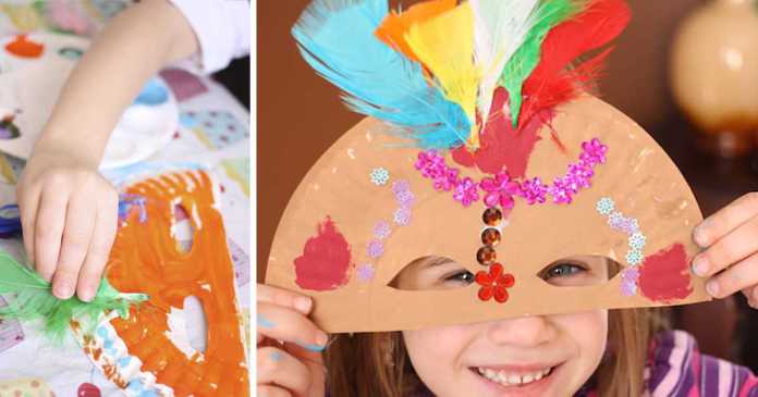 Papírový talíř rozstřihněte napůl. Každá polovina vystačí na jednu masku. Teď masku přiložte na obličej a tužkou označte místa, kde máte oči. Na tom místě nakreslete tvar očí a vystřihněte je. Vyzkoušejte, jestli přes otvory vidíte, podle potřeby upravte. A teď se vrhneme na zdobení. Nejdříve masku nabarvěte barvami nebo pastelkami podle fantazie. Po zaschnutí se můžete pustit do další dekorace masky – peříčka, kamínky, knoflíky, nálepky, lesklé flitry – vše nalepte a nechte zaschnout. Maska už je skoro hotová! Na okraje masky připevněte sešívačkou gumu do kalhot, aby vám maska dobře držela na hlavě. Nebo pokud chcete masku u očí jen přidržovat, lepící páskou připevněte zezadu dřevěnou tyčku na držení.