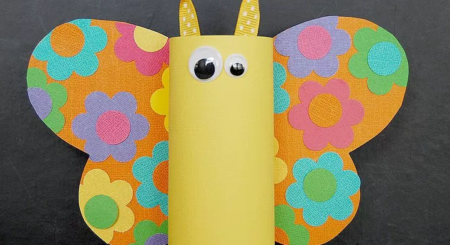 Ruličku přilepte na křídla a je to. Motýlkem si můžete vyzdobit pokojíček nebo ho použít jako stojánek na pastelky.