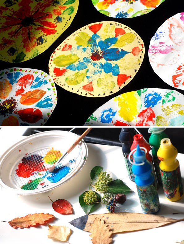 Vystřihněte ze čtvrtky kolo o velikosti velkého talíře. Listy potřete barvou a obtiskávejte. Střídejte barvy až vám vznikne pravidelný obrazec, kterému se říká „mandala“. Okraje a prostředek dobarvěte podle fantazie.