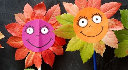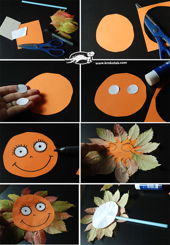 Z barevného papíru vystřihněte kolečko. Z bílého papíru vystřihněte dvě malá kolečka. Ty nalepte jako očička. Fixou namalujte obličej. Z druhé strany začněte lepit listy po obvodu dokola.