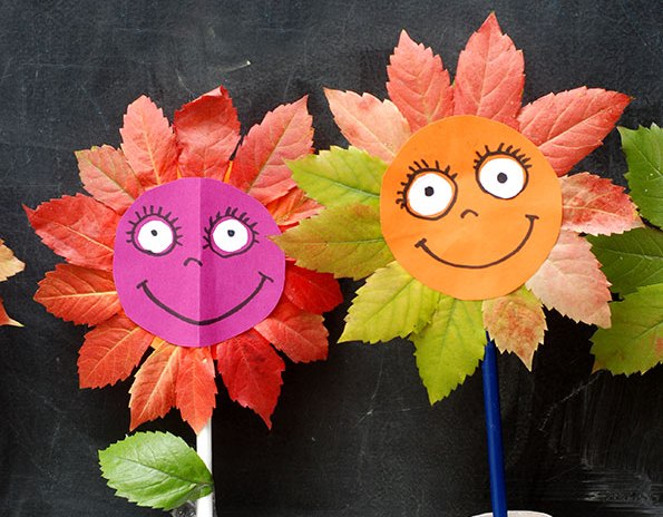 Ve spodní části obličeje kytičky si nechte místo na přilepení špějle nebo tyčky. Hotovou kytičku v podzimním kabátku zapíchněte třeba do květináče.