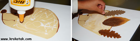 Nejdřív s maminkou nakreslete tvar ježka na hnědý papír, vystřihněte. Nalepte ježka na čtvrtku. Domalujte mu obličejík a začněte lepit listy hustě vedle sebe, tak až vytvoříte opravdu pořádný ježurkový kožíšek.