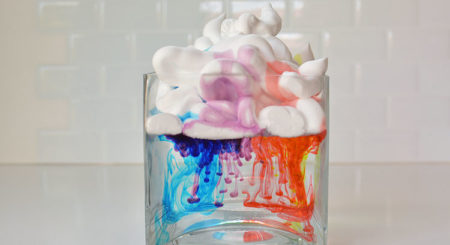 Do velké průhledné mísy nebo džbánku nalijte zhruba do dvou třetin vodu. Na vodu nastříkejte potřebné množství pěny na holení tak, aby zakryla celou hladinu a přitom vypadala jako naducaný mrak, ze kterého má začít každou chvíli pršet.