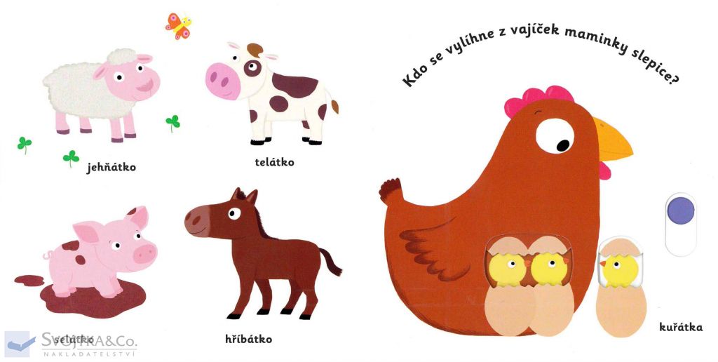 Kdo si hraje u maminky kočky? Kdo se vylíhne z vajíček maminky slepice? Kdo se skrývá v teple klokaní kapsy? Kdo se prochází s tatínkem tučňákem? Tihle a mnozí další už se těší, až si s nimi budeš hrát! Stačí jen vložit prstík do správného otvoru a lehce vysunout, zatáhnout nebo otočit ve směru šipky.