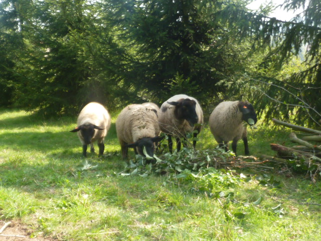 Kromě trávy, kterou tam krásně zastřihávají (jsou to vlastně takové živé sekačky na trávu), zbožňují čerstvé listy na ovocných stromech. Občas si pro ně skočí přes plot a zpestří si tak jehelníček. Tedy JÍDELNÍČEK, samozřejmě jídelníček. Jejich pán pak ale není moc rád 🙂