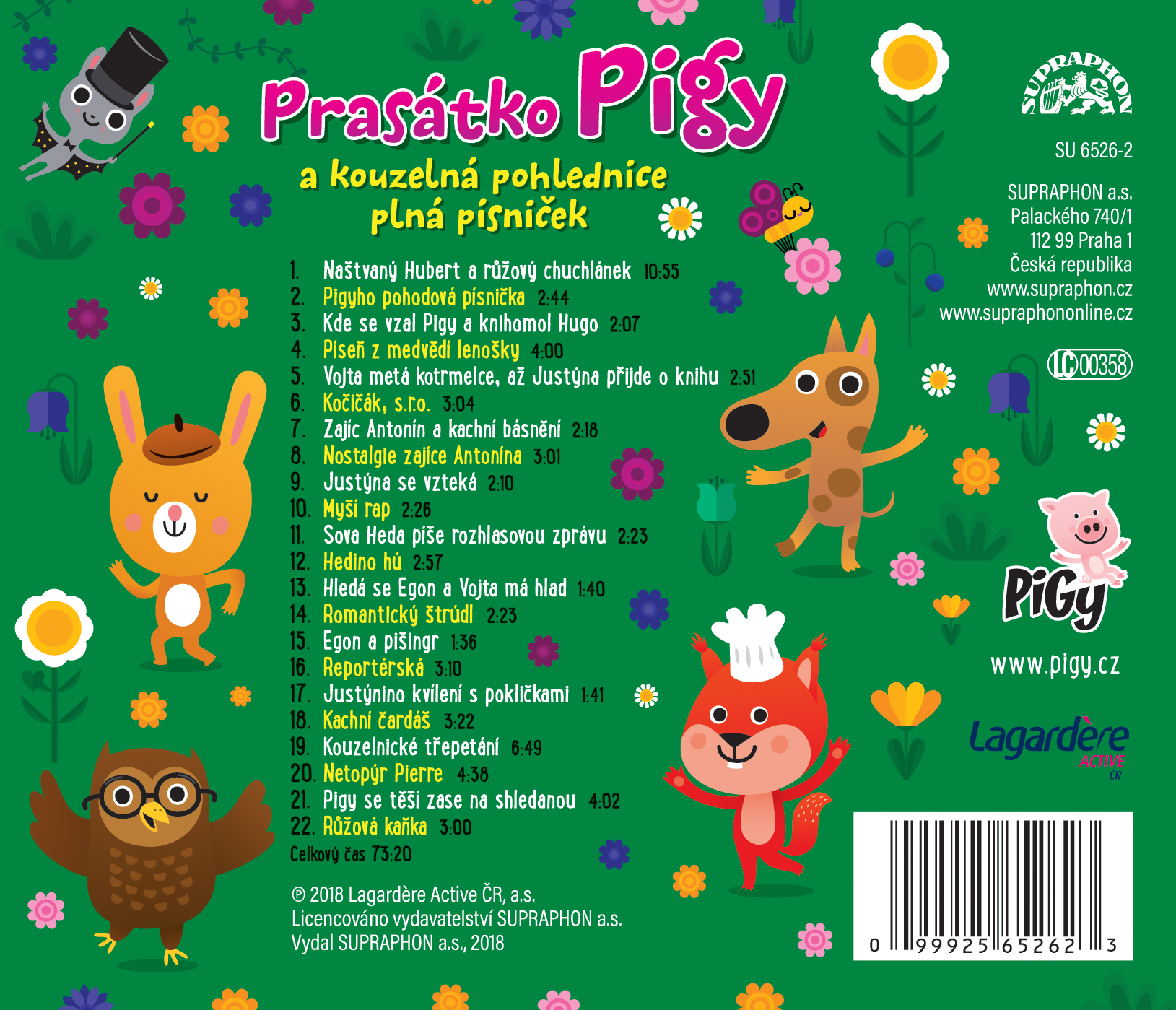 představte si! Právě teď vydáváme se všemi mými kamarády první CD! Album se jmenuje Prasátko Pigy a kouzelná pohlednice plná písniček na jeho tvorbě se podíleli samí šikovní lidé. Každé zvířátko má na albu svou písničku – zanotujeme si Laskončin Romantický štrúdl i Hugovu Píseň z medvědí lenošky. Uvidíte, že nudit se rozhodně nebudete. Písničky jsou střídány pohádkovými příběhy. Při poslechu se vám bude krásně usínat i tancovat.