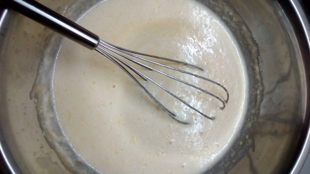 Troubu dejte hřát na 180 st. Mezitím se pusťte do těsta. V hrnečku rozpusťte 70 g másla + 1 polévkovou lžíci navíc a nechte ho chvilku vychladnout. Do mísy rozklepněte celé vejce a přidejte 3 žloutky (s oddělením žloutku od bílku si nechte pomoct od rodiče). K vejcím přisypte odměřený cukr, špetku soli a vše metličkou pořádně zamíchejte. Potom přidejte sušenou citrónovou kůru, vanilkový extrakt a mouku. Opět důkladně promíchejte. V poslední fázi budete přilévat tekutiny – nejprve mléko, potom smetanu a na úplný závěr rozpuštěné máslo (nezapomeňte si nechat 1 polévkovou lžíci stranou!!!). Vznikne vám poměrně řídké těsto, což je ale správné.