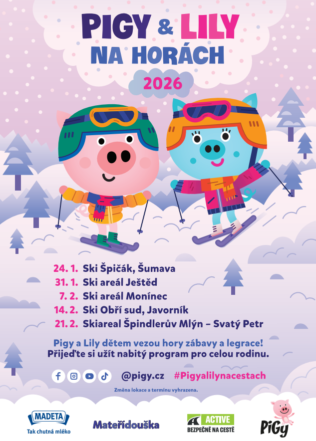 Představte si, že prasátka Pigy & Lily vyráží opět na české hory a vezou s sebou kupu zábavy! Těšit se můžete na bohatý program plný písniček, tancování, kouzlení a také dárků od Pigyho, časopisu Mateřídouška nebo Kapitána Lipánka!