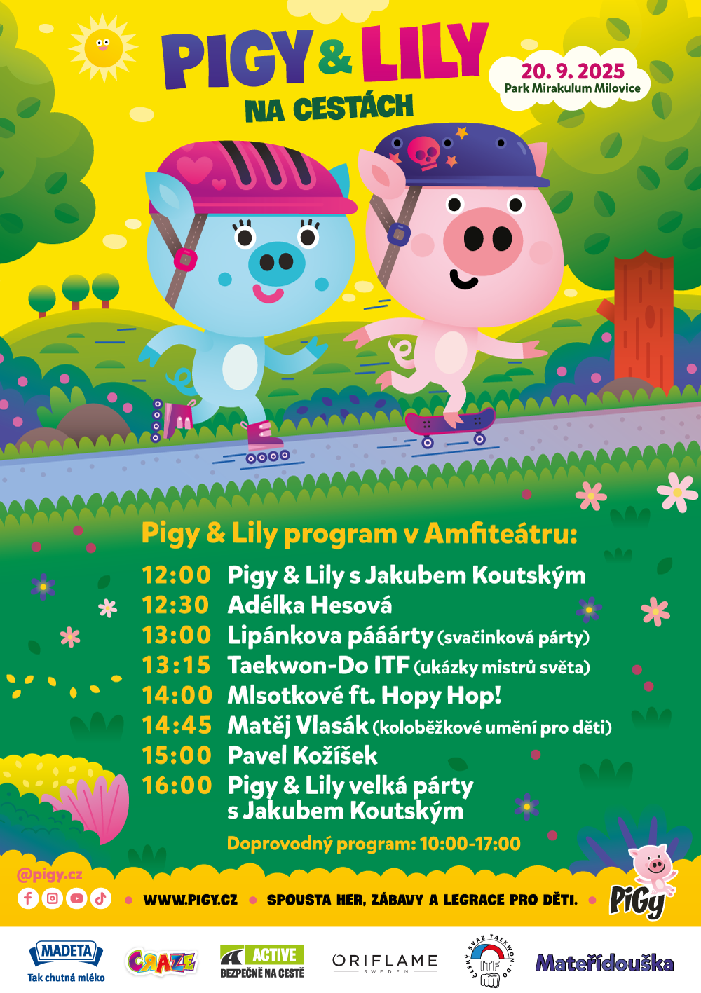Už se to blíží! V sobotu 20. září se uvidíme na super akci Pigy & Lily na cestách v parku Mirakulum v Milovicích. Čeká vás opět nadupaný program na podiu! Těšit se můžete na Adélku Hesovou, Mlsotky a zajíčky Hopy Hop!, kouzlení s Pavlem Kožíškem, Lipánkovu Pááárty a také tam budu já Pigy a kamarádka Lily. Zkouknout můžete ukázky mistrů světa sportu s názvem Taekwon-Do ITF. Celým dnem nás provede Jakub Koutský.