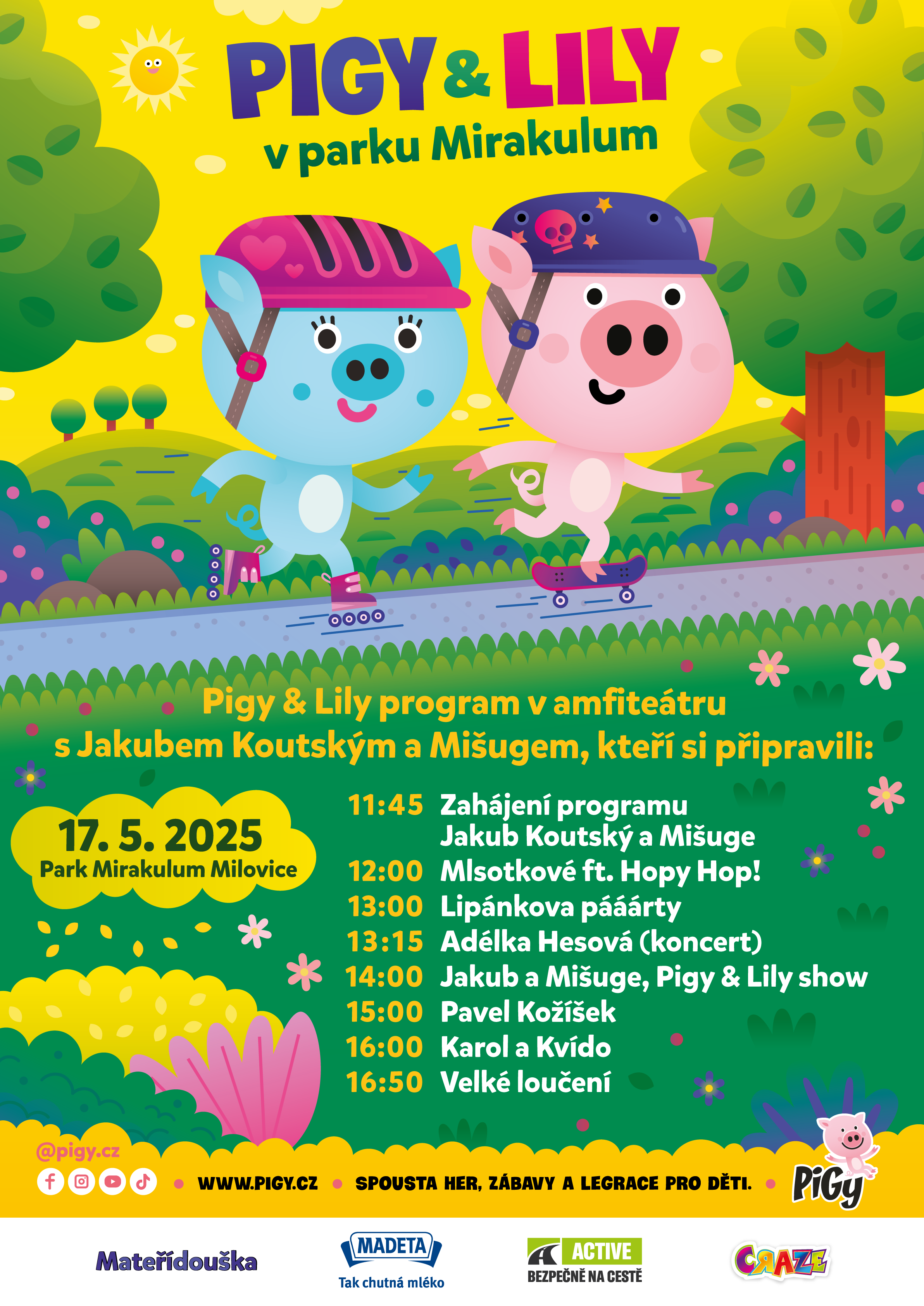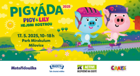 Tihle všichni vás zvou na akci epických rozměrů! V sobotu 17. května se koná Pigyáda v parku Mirakulum v Milovicích. Celým dnem vás provedou prasátka Pigy & Lily, která si pozvala spoustu skvělých hostů, kteří zabaví malé i velké, a na všechny čeká bohatý doprovodný program, zábavné soutěže a dárky! Park je otevřen od 10:00 hodin, program začíná v 11:45 hodin.
