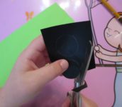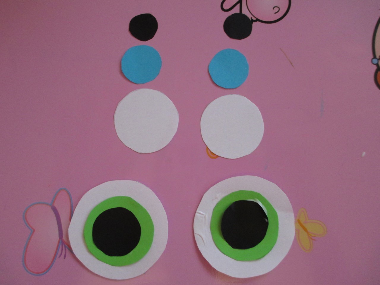 - Postupně je na sebe nalepte, abyste vytvořili oči. Mohou koukat přímo před sebe nebo do strany.