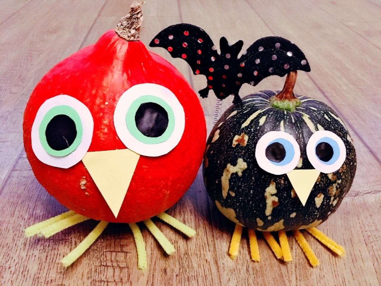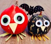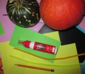 - Vezměte si lepidlo, nebo s pomocí rodičů tavnou pistoli, přilepte na horní část dýně oči, pod ně zobáček přichycený jen horní částí a nakonec zespoda nožky.