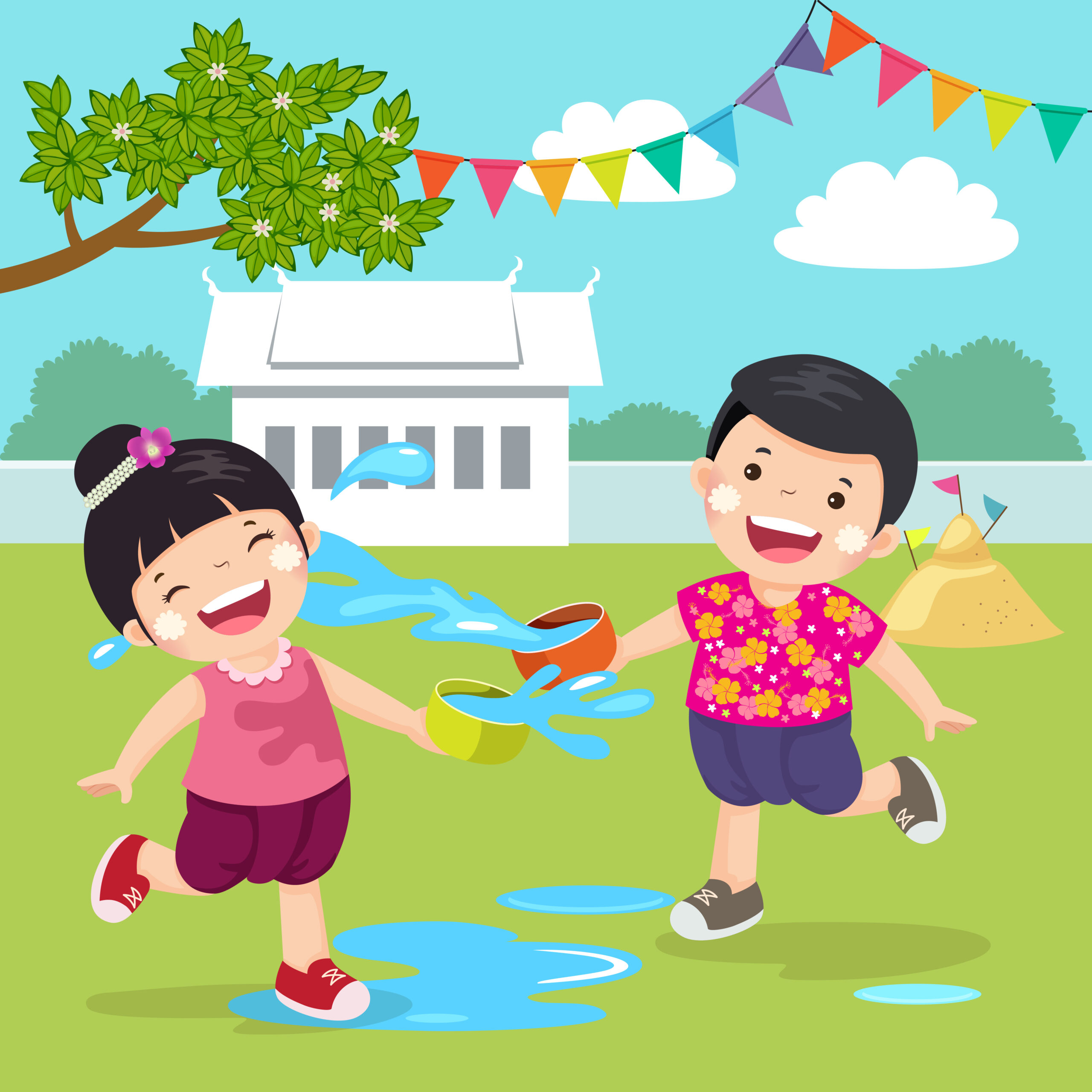 - Hráči, kteří stojí jako první v řadě, se postaví na startovní čáru v plavkách a suchém tričku. Před sebou mají postavený kyblík (oba kyblíky musí být stejně velké).