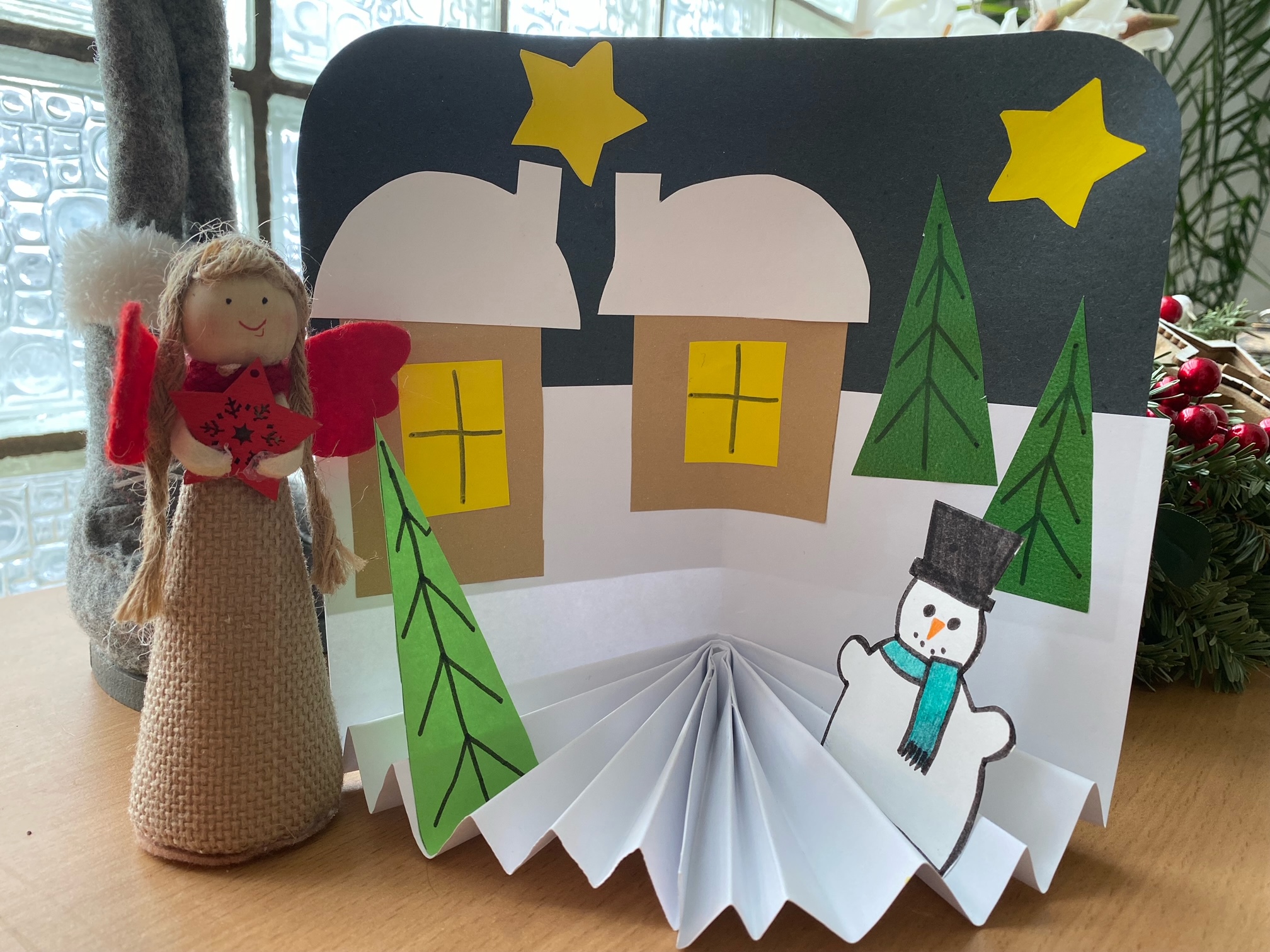 - Z dalších barevných papírů vystřihněte domečky, zasněžené střechy, hvězdy (pokud děláte noční oblohu), stromečky, přidat můžete i sněhuláky, sáňky, lyže apod.